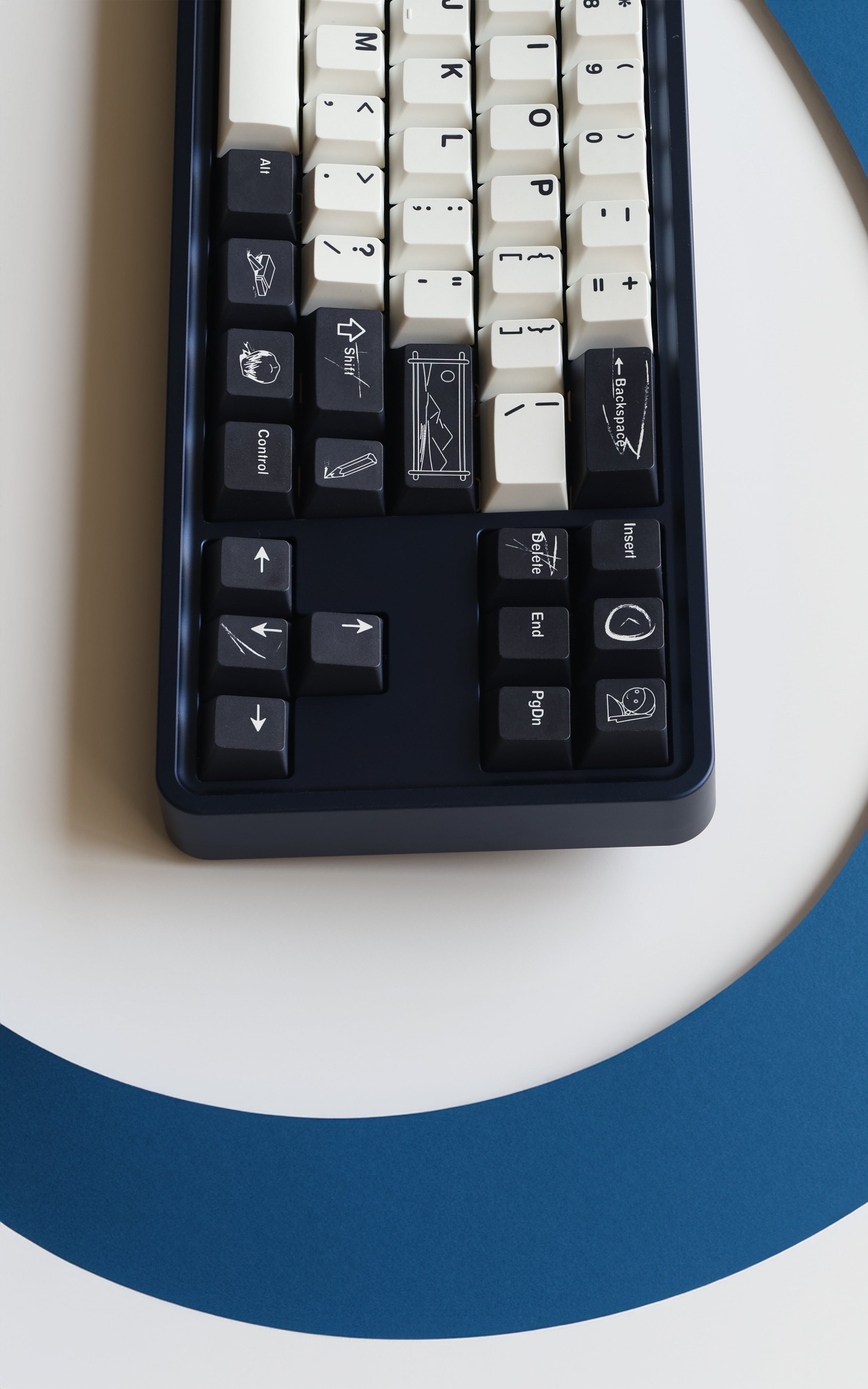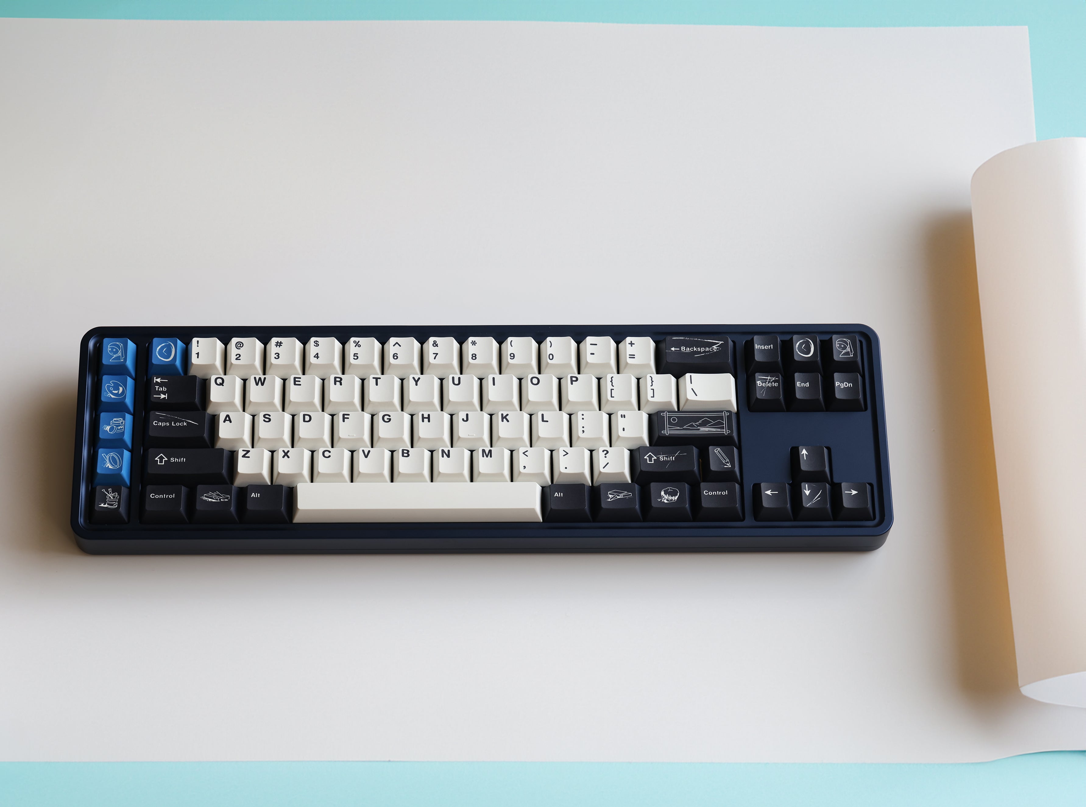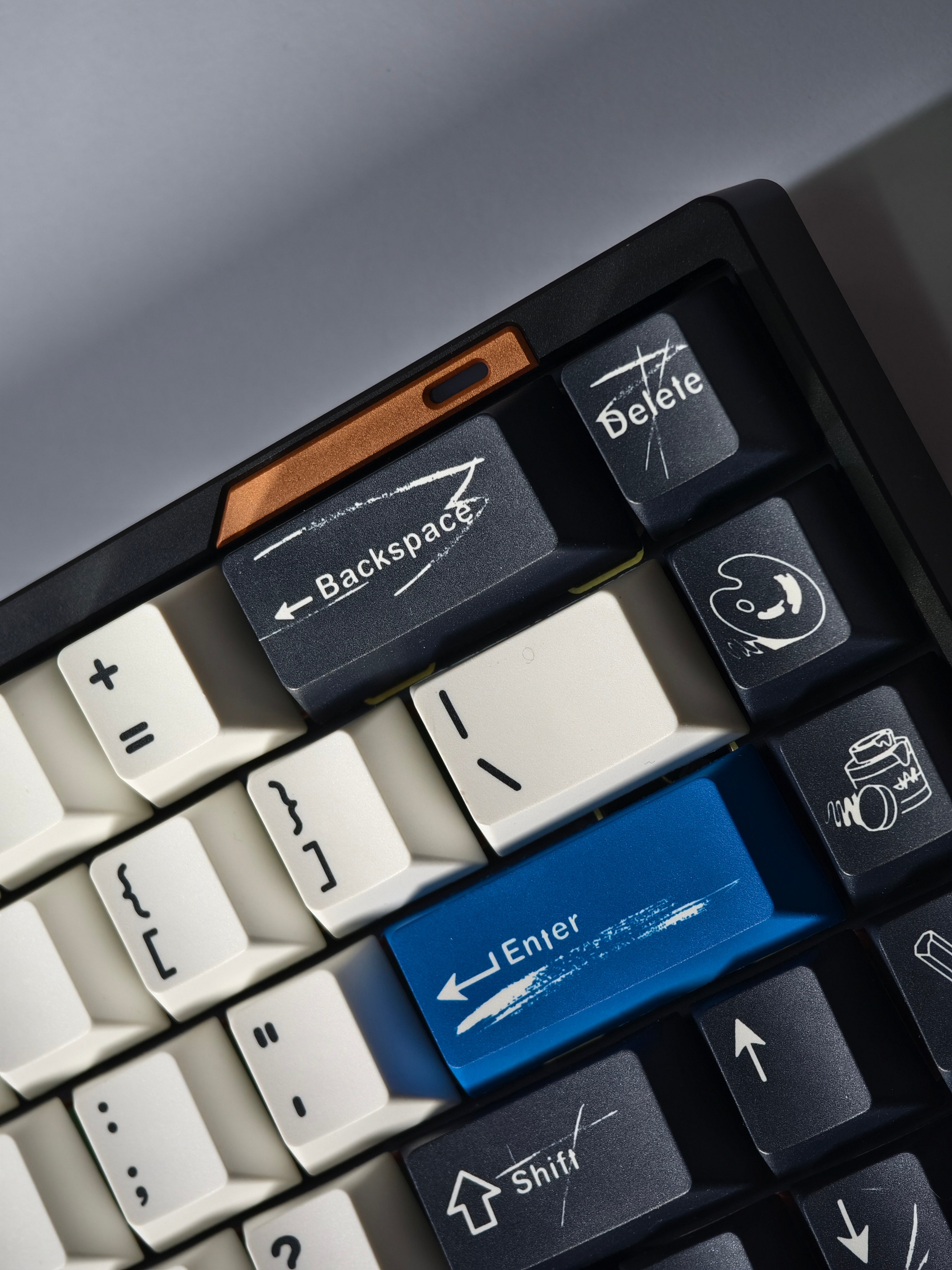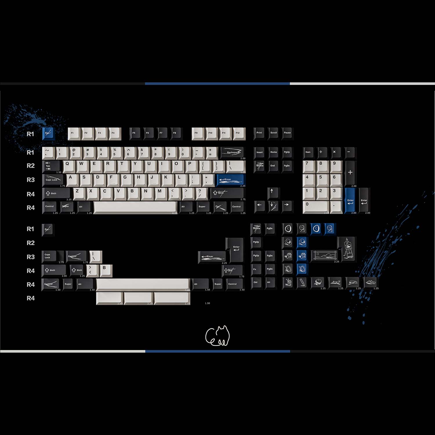 The design of this keycap set is inspired by the brushstrokes and brilliant colors left on canvas by master artists. The charcoal black and warm white keycaps are intertwined, just like the contrast on the canvas, and the ultramarine blue, the oldest color in nature, is dotted in it as if it is the painter's unique signature! This unique color scheme gives the keyboard a completely new look, as if you are creating a beautiful painting every time you press it.