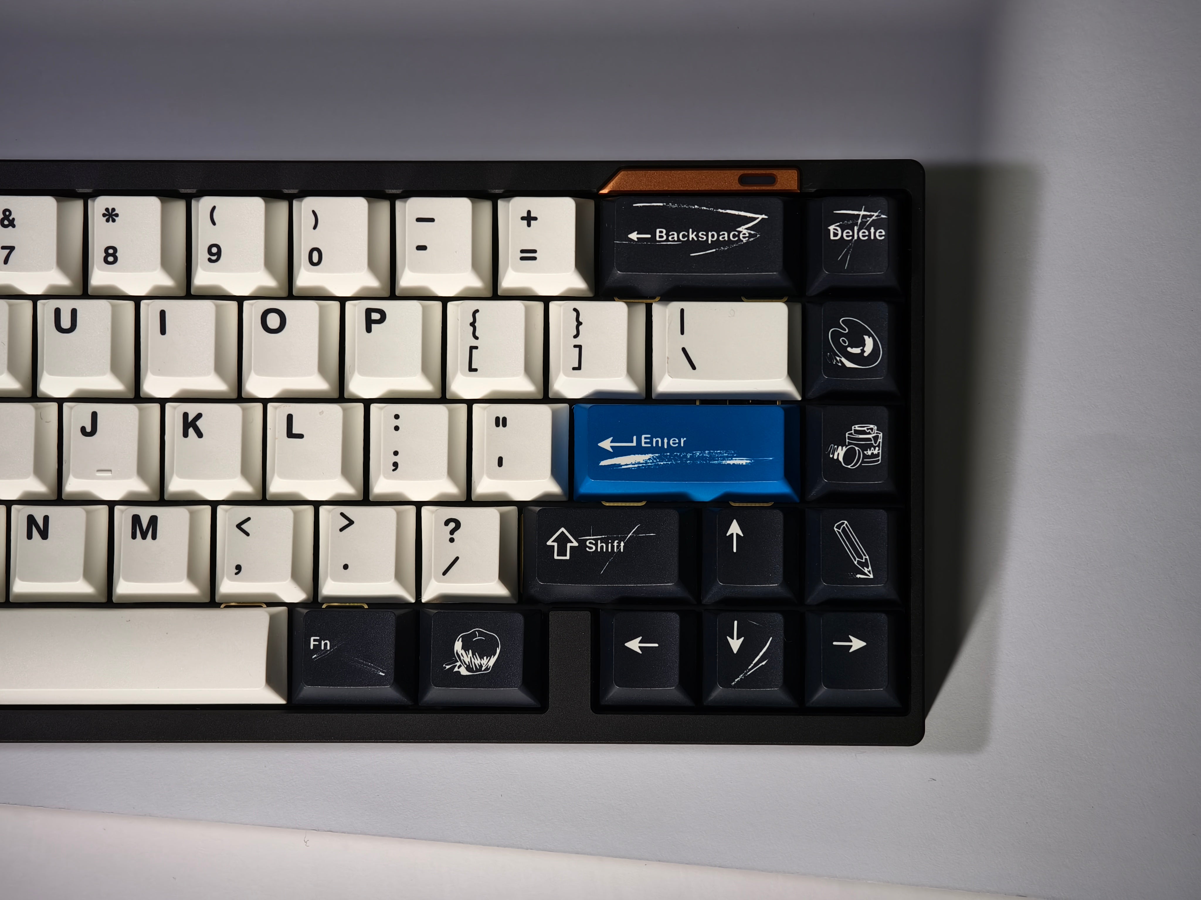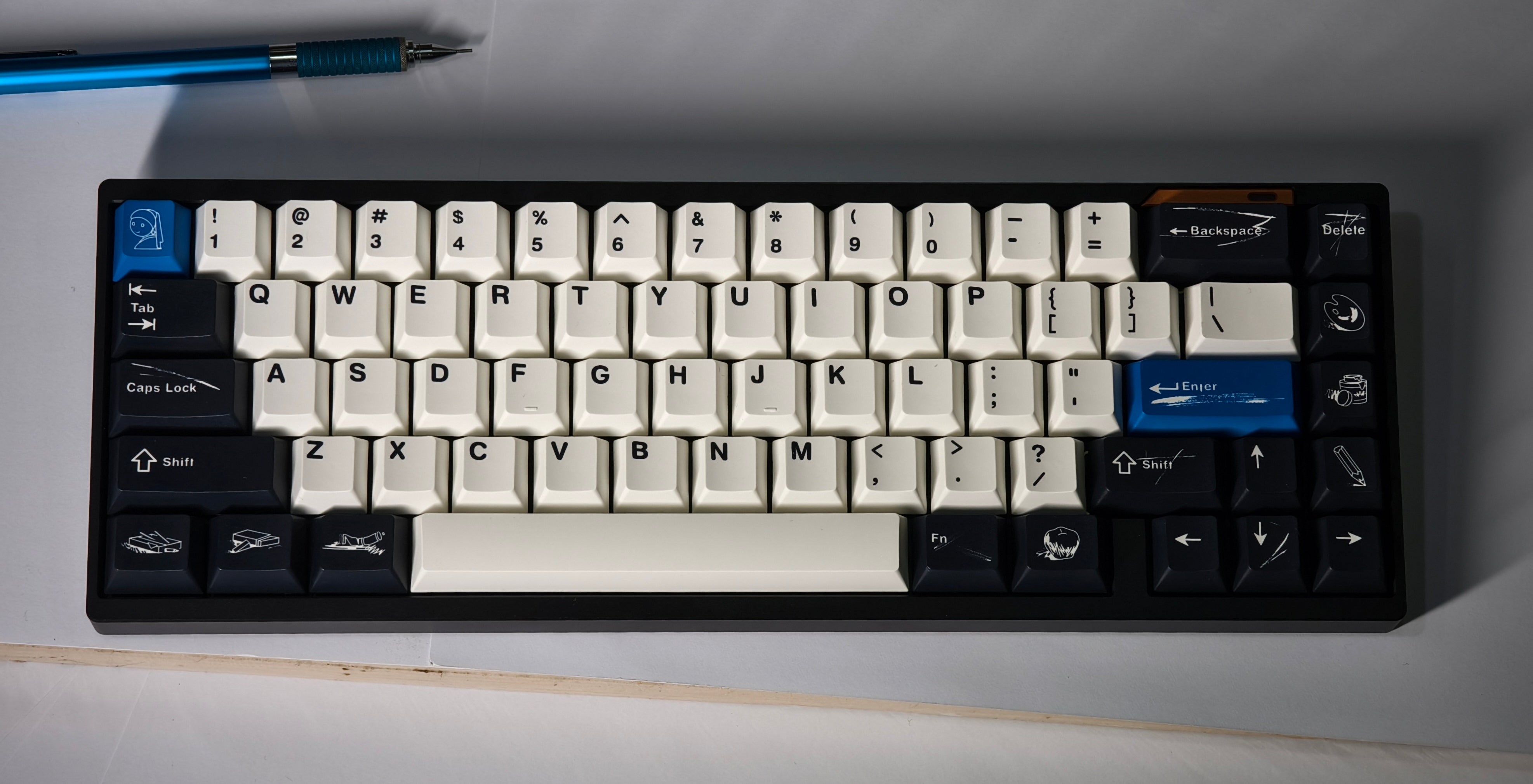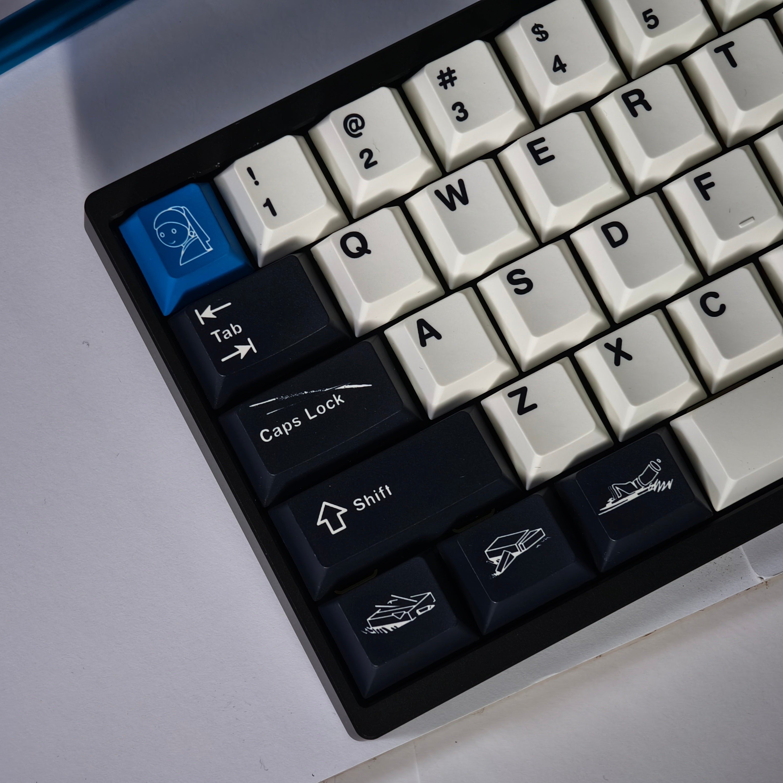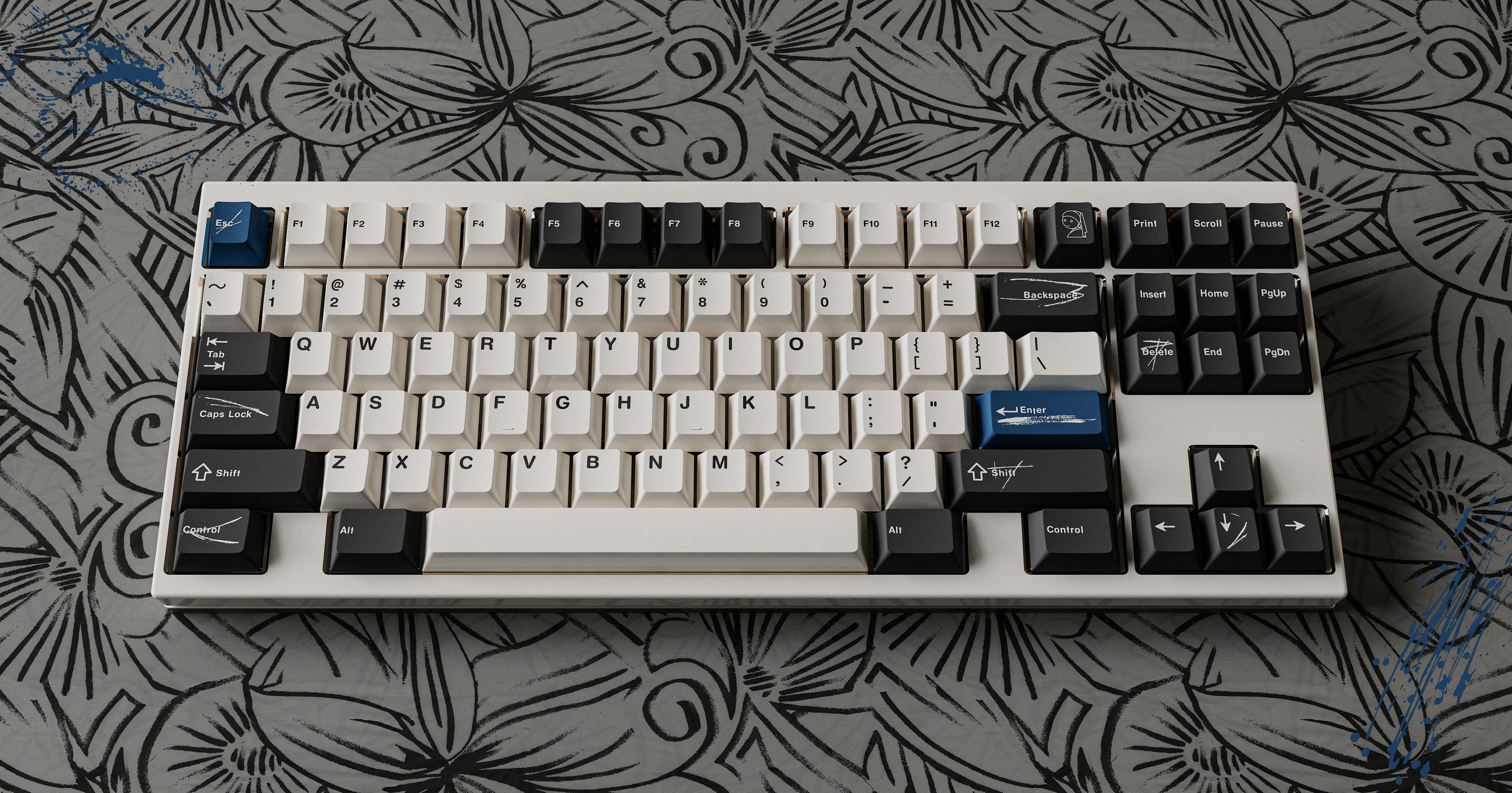 The design of this keycap set is inspired by the brushstrokes and brilliant colors left on canvas by master artists. The charcoal black and warm white keycaps are intertwined, just like the contrast on the canvas, and the ultramarine blue, the oldest color in nature, is dotted in it as if it is the painter's unique signature! This unique color scheme gives the keyboard a completely new look, as if you are creating a beautiful painting every time you press it.